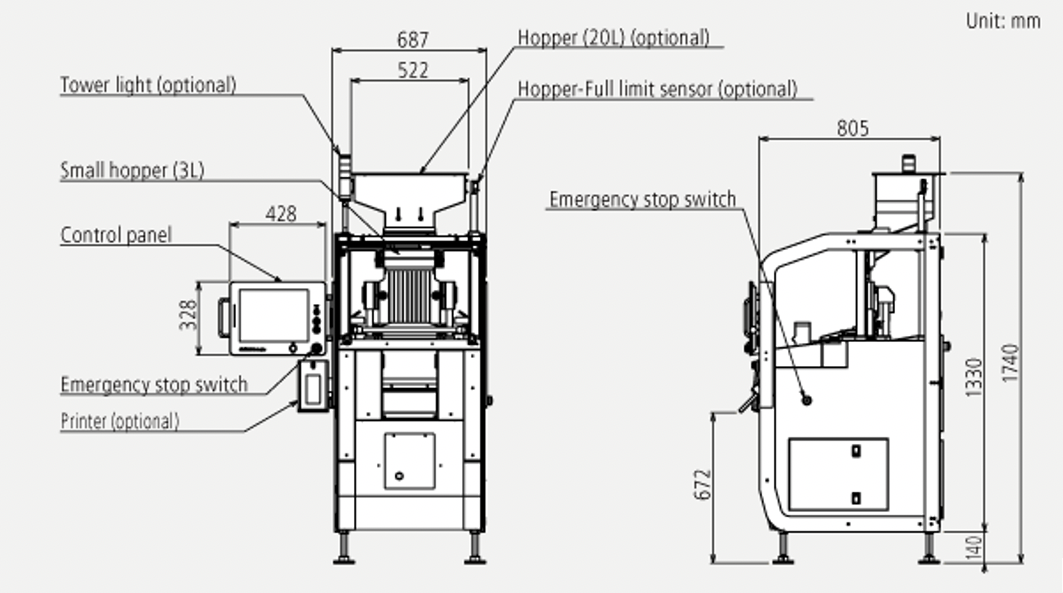 Örnek Model: KWS9001AP10 – 10 yollu, Maksimum kapasite: 75,000 kapsül/saat (ölçüler mm cinsindendir)