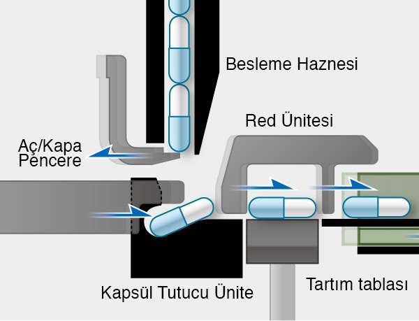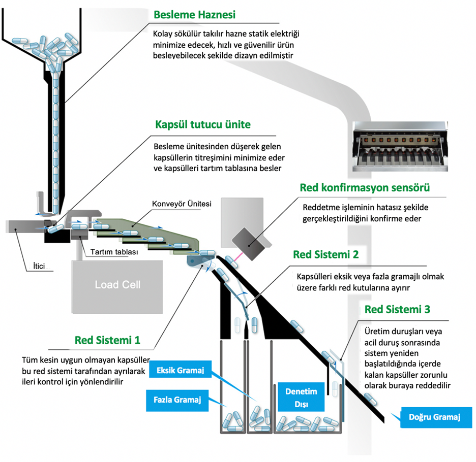 Sistemdeki tüm kapsüller kontrol ve takip edilmektedir. Hatalı kapsüller 3 red sistemi ile üretimden tahliye edilmektedir